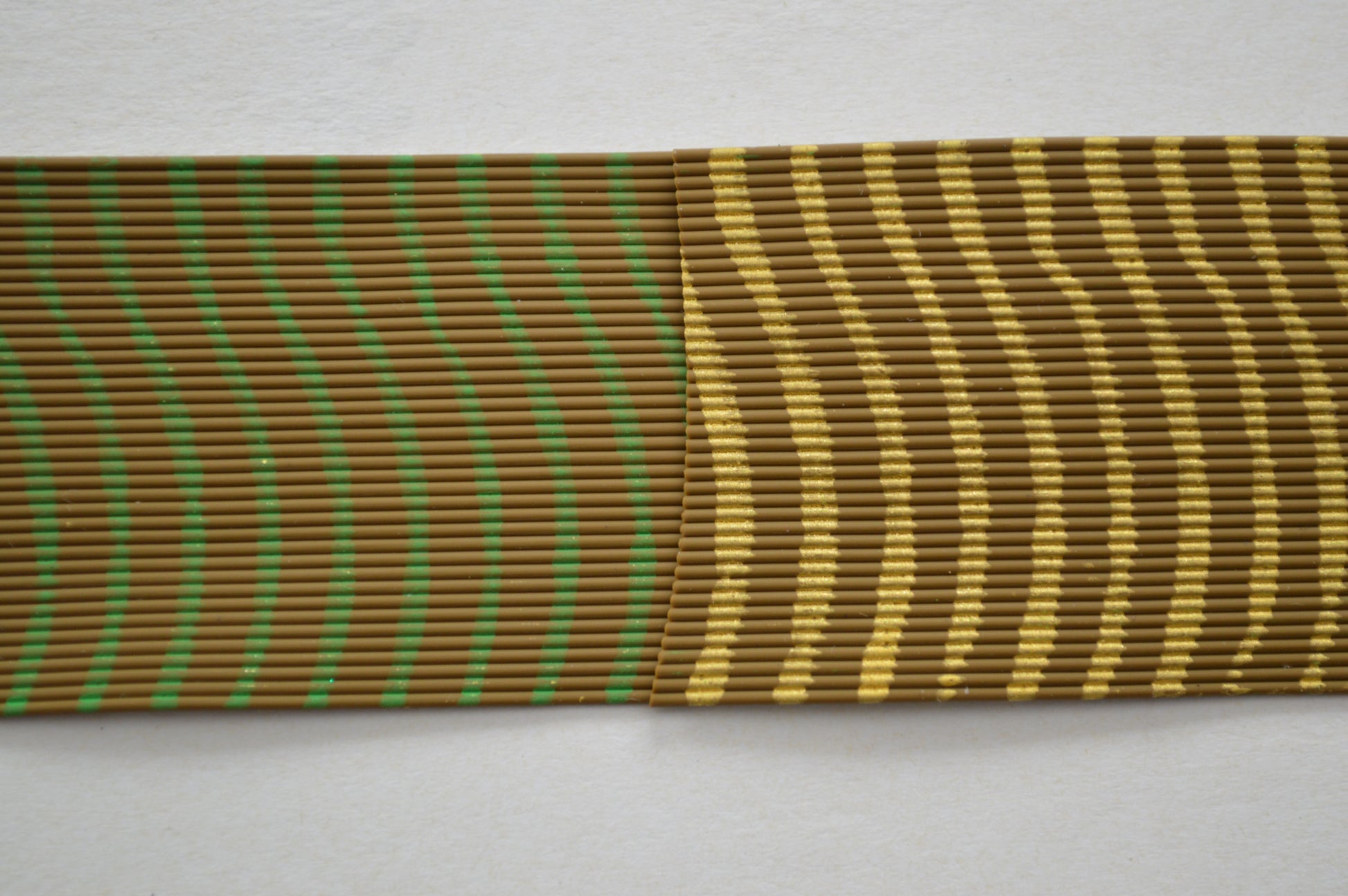 Our Medium Pumpkin-Tan Living Rubber with Lime on 1 side and Gold on the other. 40 strands.